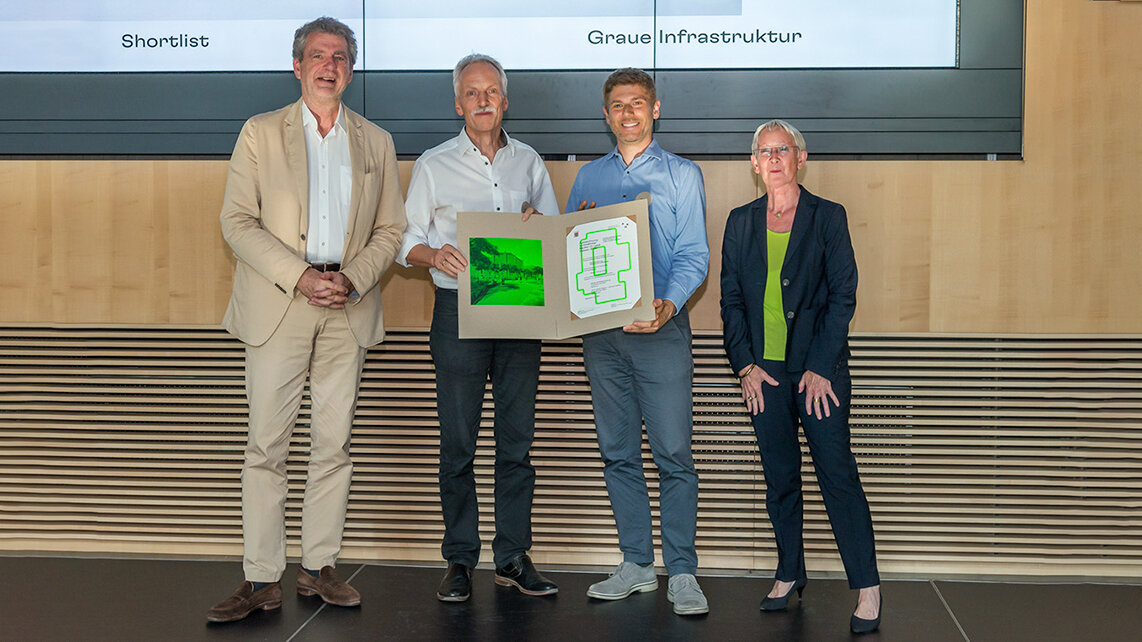 Von links nach rechts: Martin J. Worms, Staatssekretär im Finanzministerium, Stefan Kornmann, Prokurist und Partner, AS+P, Christian Hübner, Projektleiter, AS+P, Brigitte Holz, Präsidentin Architekten- und Stadtplanerkammer Hessen / @ AS+P Albert Speer + Partner GmbH