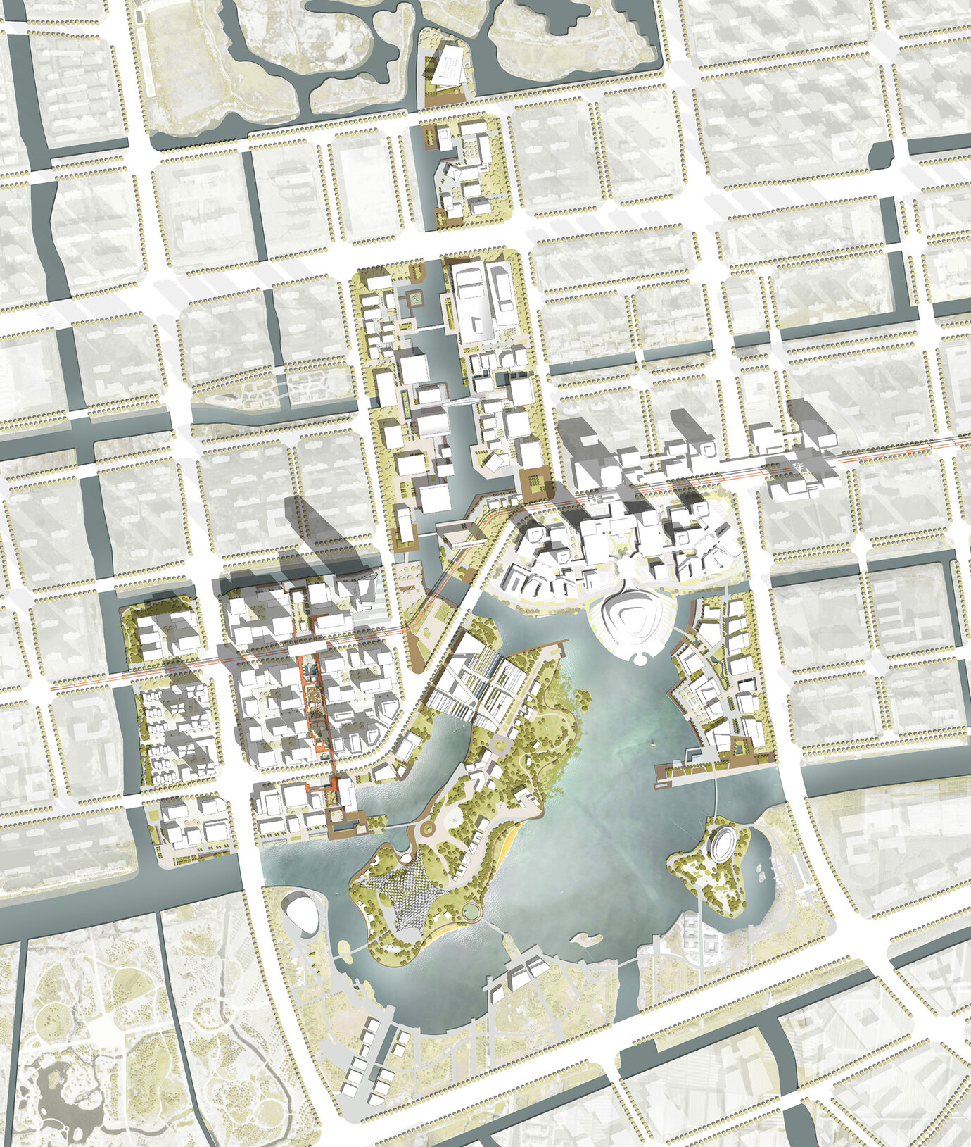 AS+P 的方案强调,从北部的博物馆到南岸开口的通道形成一条文化轴。文化轴两侧分布着两个混合利用街区,街区拥有地标性建筑和自己的南北轴,还有一扇风格鲜明的大门,大门前有一座悬轨站。通过大小不同的面积、容量和空地,为原本棋盘式的规划模板巧妙地赋予了鲜活的个性。湖边的规划具有人文特色,设计模板变得更加有机,与上海的新天地类似的现代化购物步行街则使湖边的文化设施更加完整。