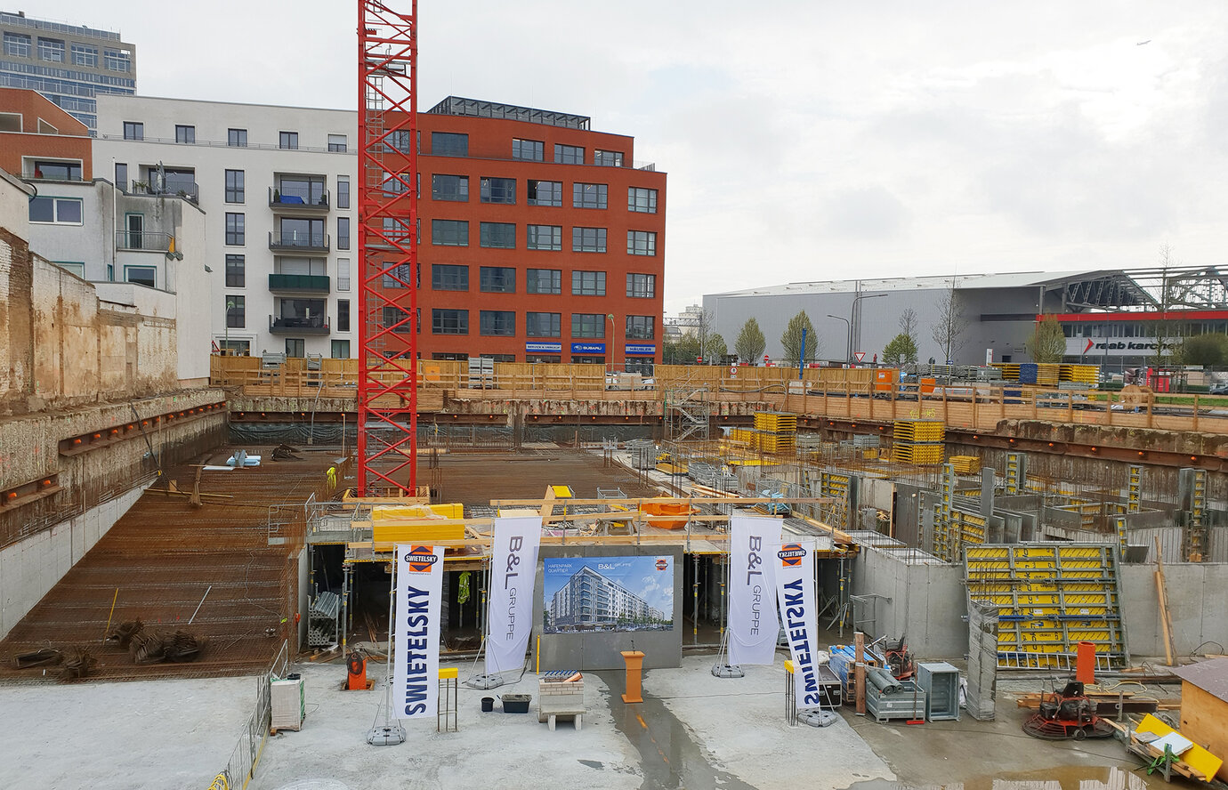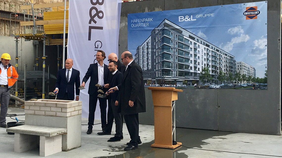 Am Mittwoch wurde der Baustart auf dem Areal des ehemaligen Osthafens in unmittelbarer Nähe zur Europäischen Zentralbank in Frankfurt am Main gefeiert. Planungsdezernent Mike Josef legte gemeinsam mit Martin Teigeler, Partner und Mitglied der Geschäfts­leitung bei AS+P, Thorsten Testorp, geschäftsführender Gesell­schafter der "B&L Gruppe" sowie Alf M. Prasch, Geschäfts­führer des ebenfalls beteiligten Archi­tek­tur­büros prasch buken partner architekten partG mbB, und Anton Prossliner, Geschäfts­führer des Generalunternehmers SWIETELSKY Baugesellschaft, im Beisein von Pressevertretern und geladenen Gästen symbolisch den Grundstein.