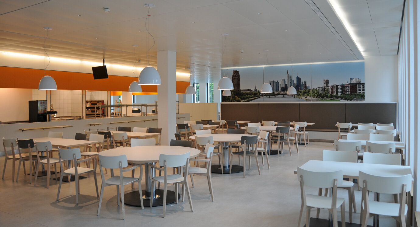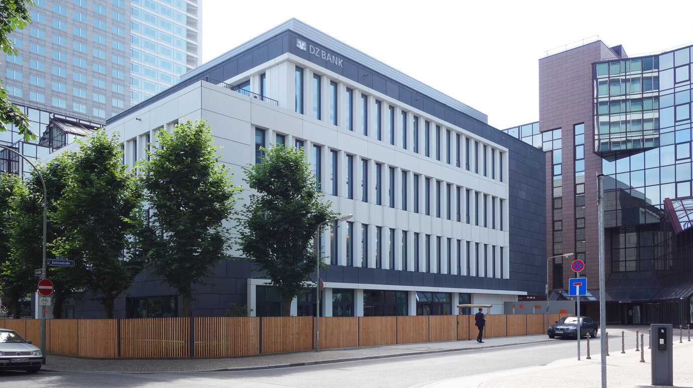 Der viergeschossige Pavillon ergänzt den Gebäudekomplex der DZ BANK an der Mainzer Landstraße und umfasst neben einer Kinderbetreuungseinrichtung, einer erweiterten Kantine und Konferenz- und Besprechungsräumen auch eine Fahrradgarage mit Umkleidemöglichkeiten im Untergeschoss. Die Erschließung des Pavillons erfolgt über eine Brückenanbindung aus dem Bestand.