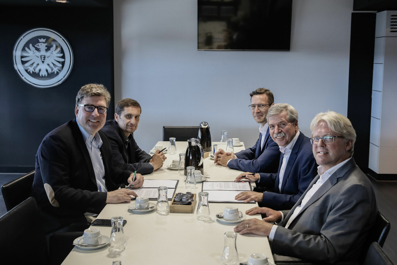 Die Vorstandsmitglieder der Eintracht Frankfurt Fußball AG Oliver Frankenbach und Axel Hellmann unterzeichneten am 17. August 2018 gemeinsam mit der Geschäftsführung der AS+P Albert Speer + Partner GmbH den Architektenvertrag für das ProfiCamp