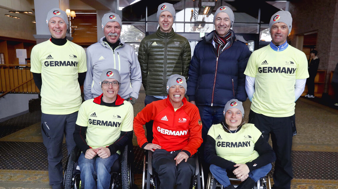 Obere Reihe v.l.: David Meiworm (Physiotherapeut paralympische Nationalmannschaft Ski Nordisch), Friedbert Greif (AS+P), Phillip Michler (PROPROJEKT), Thomas Dieckhoff (Deutsche Sport Marketing), Ralf Rombach (Bundestrainer paralympische Nationalmannschaft Ski Nordisch) Untere Reihe v.l.: Martin Fleig, Andrea Eskau, Anja Wicker (Para­lympische Athleten) / Quelle: Picture-Alliance / Fotograf: Jeon Heon-Kyun