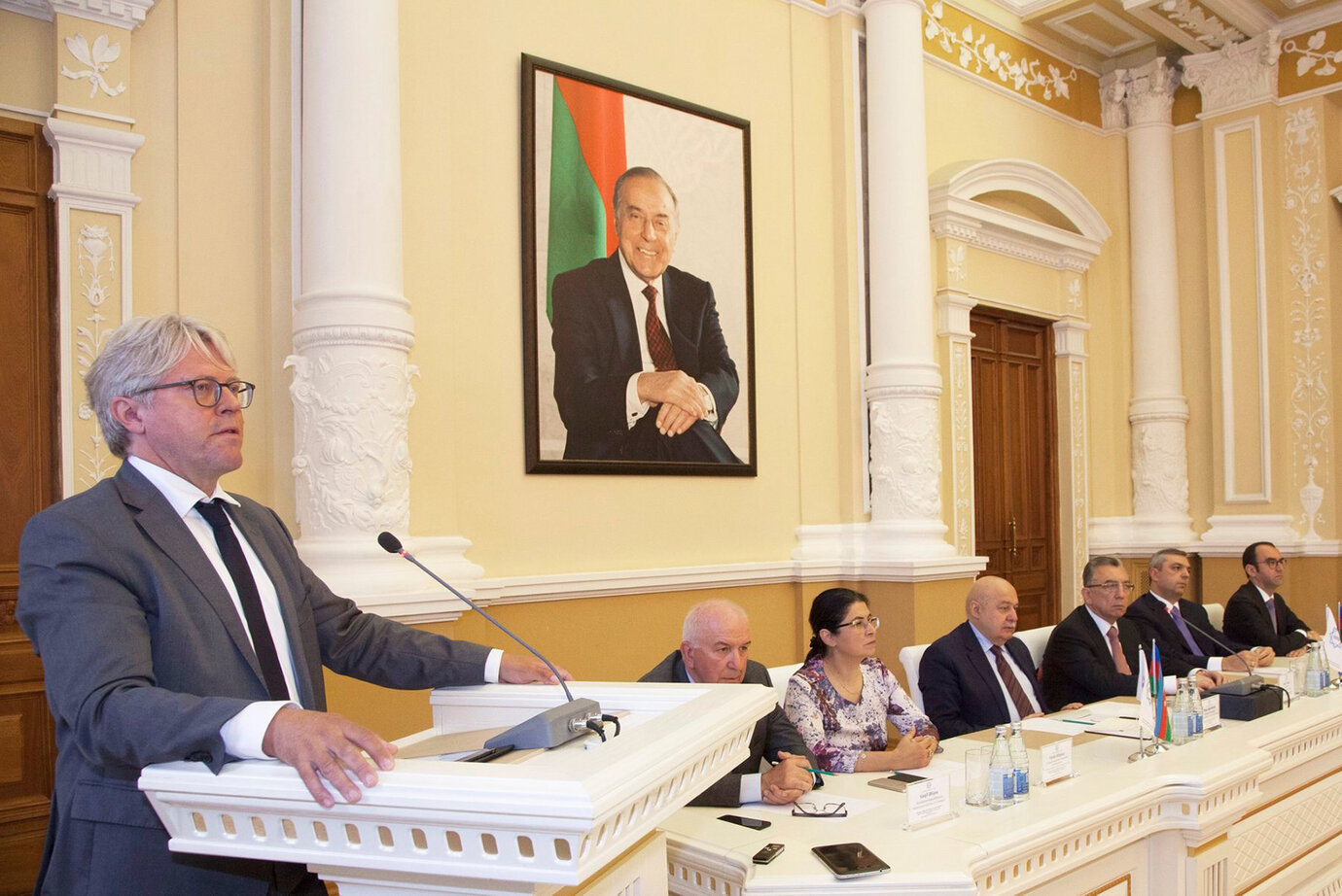 首席执行官Joachim Schares在全体会议上发表讲话。 © 阿塞拜疆共和国国家城市规划和建筑委员会
