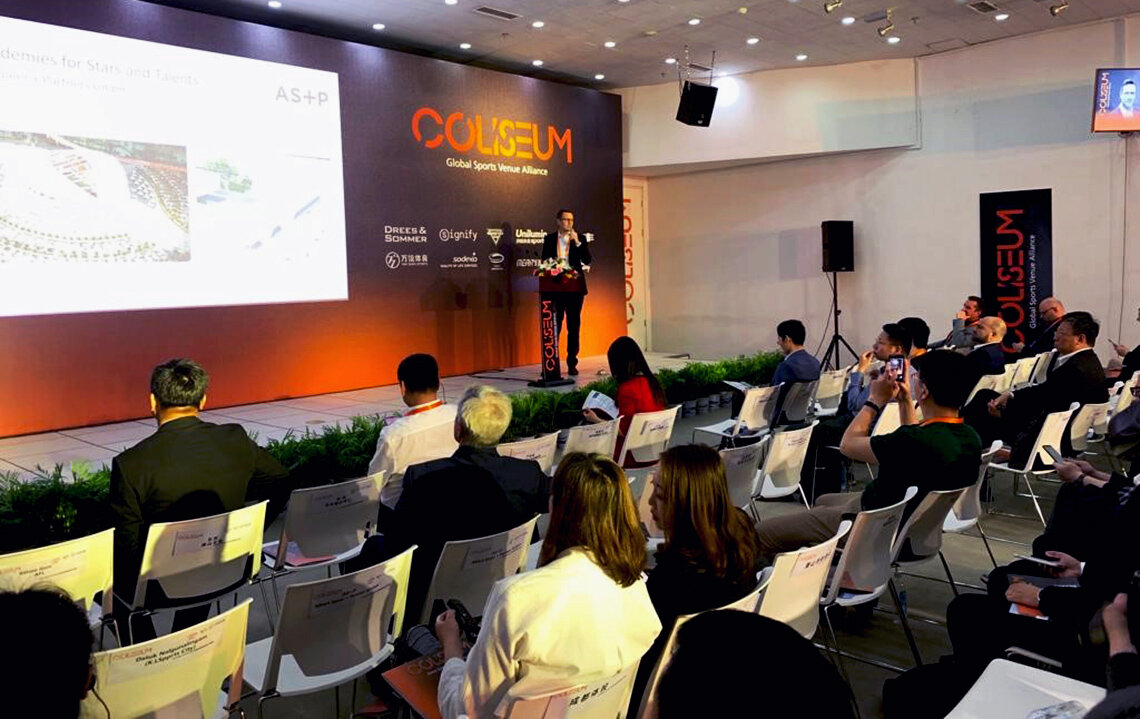 AS+P 总经理 Axel Bienhaus 在北京亚太峰会上发表演讲,演讲谈及体育设施可能产生的协同效应。