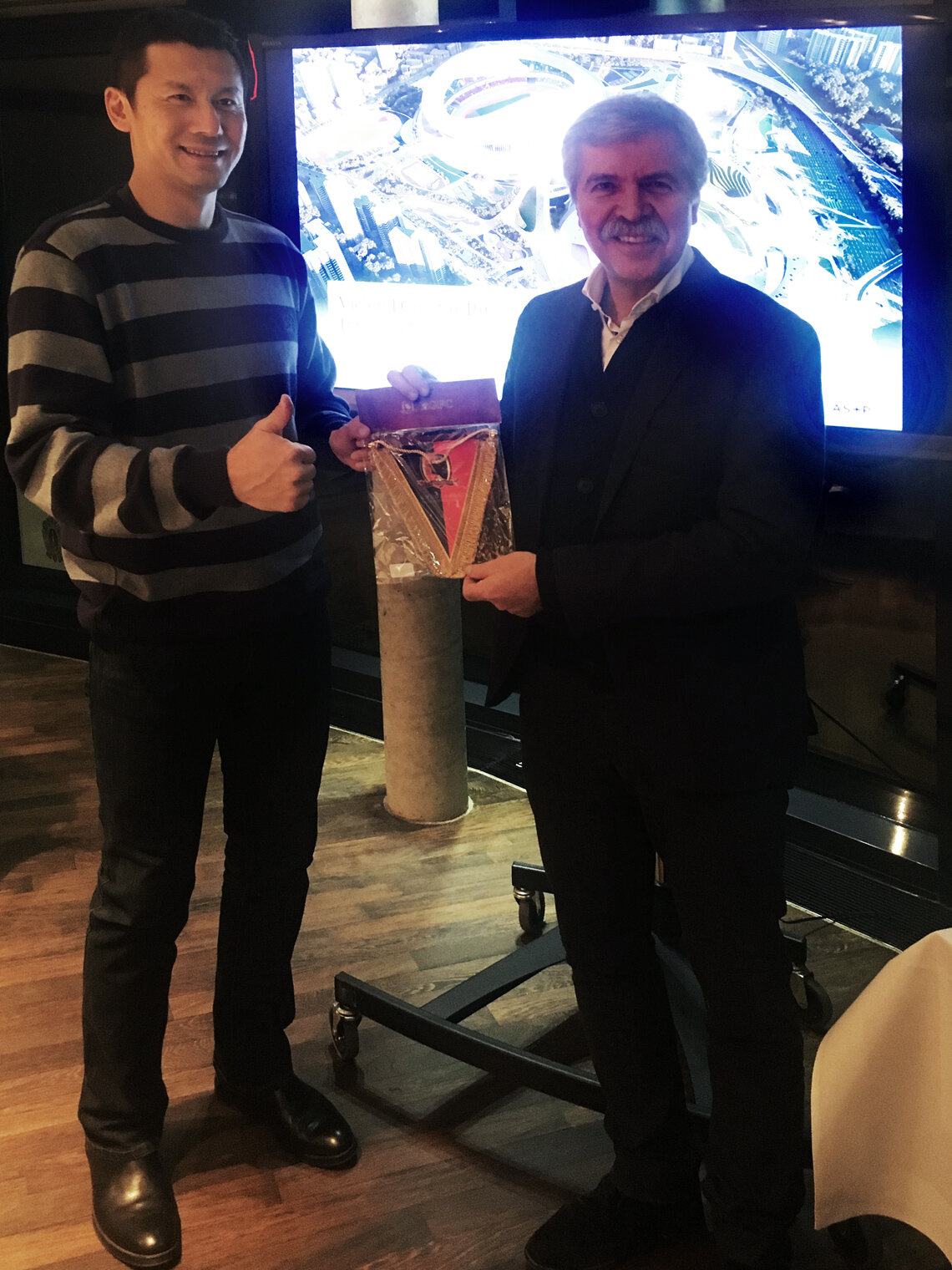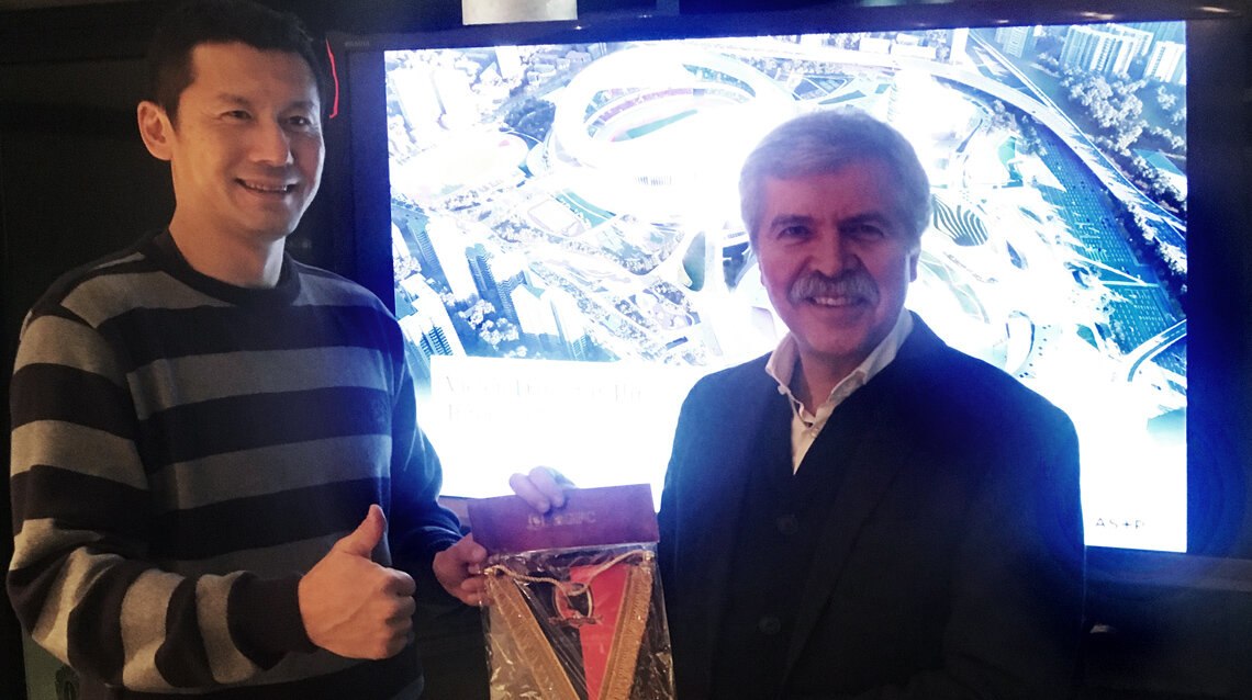 Friedbert Greif, geschäftsführender Gesell­schafter bei AS+P, stellte bei dem Besuch der chinesischen Delegation unter der Leitung der deutsch-chinesischen Fußballlegende Yang Chen bei der Eintracht die Sportstättenplanungskompetenzen von AS+P in Deutschland, China und den arabischen Ländern vor.