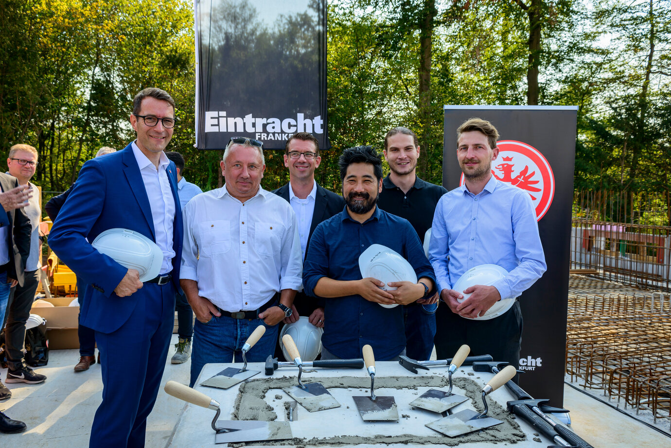 在施工现场举行的官方奠基仪式上座无虚席:8 月 27 日星期二,建筑公司负责人、法兰克福市市长以及市相关部门负责人、德国足球联合会、FAAG 公司和 AS + P 公司的建筑师以及众多媒体代表齐聚一堂,庆祝法兰克福足球俱乐部专业球员的新基地奠基成功。甚至是法兰克福足球俱乐部的主教练、队长和守门员也出席了奠基仪式。