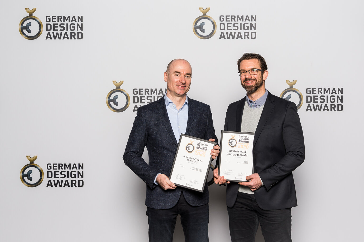 杰出获奖者: 项目合伙人Nils Müller和联合合伙人Matthias Dilger代表AS+P团队领奖。©德国设计委员会 | 摄影:Lutz Sternstein团队