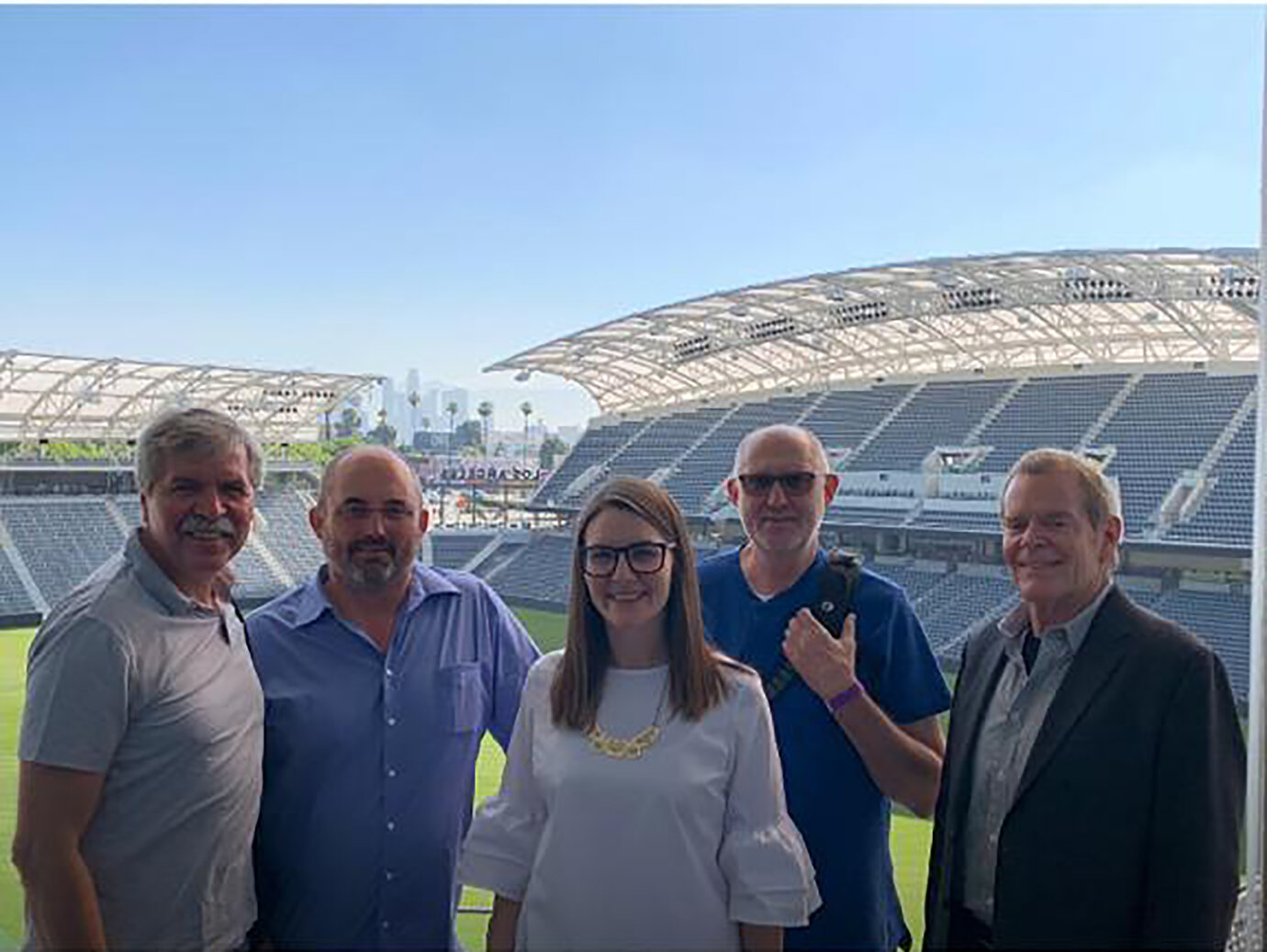 左起:Friedbert Greif(AS + P 总经理),Matthias Schöner(AS + P 的联合合作伙伴),Patti Harburg-Petrich (buro happold),Klaus Teichert(Hertha BSC Stadium GmbH 总经理),Ronald F. Turner(Gensler,体育场建筑师)参观加州银行体育场 (Banc of California Stadium)。照片© Klaus Teichert