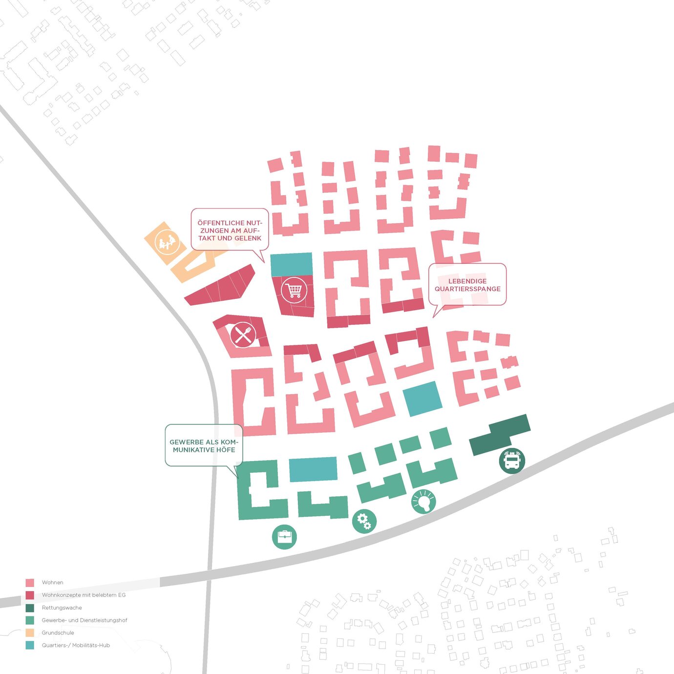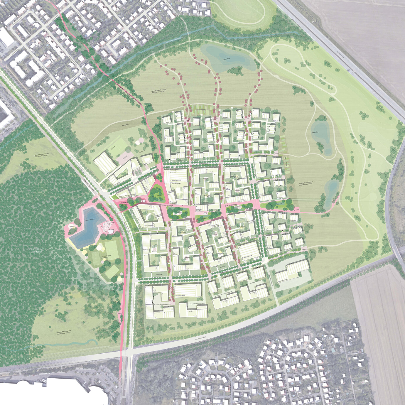 Das neue Stadtquartier enthält eine besonders flächensparende Blockstruktur, die sich zum attraktiven Landschaftsraum und den Nachbarquartieren hin auflöst. Maßstäblichkeit, Durchlässigkeit und Vernetzung stärken den sozialen Zusammenhalt und das Gemeinwohl. Den Auftakt bildet ein lebendiger Platzraum als Herz des Quartiers, als klare, spannungsvolle Adresse und als Gelenk. Das Gewerbeband im Süden sichert den Schallschutz und damit eine hohe Wohnqualität im dahinterliegenden Quartier.