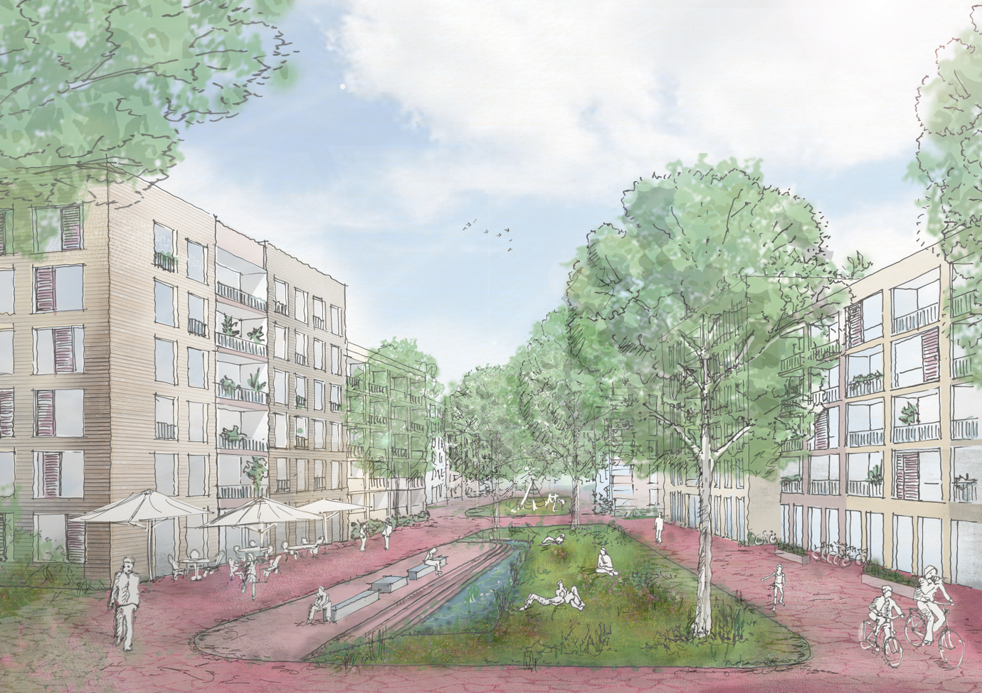 Er vernetzt die umliegenden Siedlungs- und Freiraumstrukturen miteinander und schlägt eine Quartiersspange als Urbanes Grün vor, die angrenzende Grün- und Waldflächen innerhalb des Quartiers fortsetzt. Auch in den bebauten Bereichen wird ein hoher Durchgrünungsgrad verfolgt, der gute Versickerungsmöglichkeiten gewährleistet und den Einsatz von gespeichertem Regenwasser zur Bewässerung ermöglicht. Mit Hilfe permanenter und temporärer Wasserflächen entstehen Verdunstungsmöglichkeiten, die gemeinsam mit der Verschattung durch die üppige Bepflanzung einen wertvollen Beitrag zur natürlichen Kühlung des Quartiers leisten. So wird Heiterblick Süd resilienter gegenüber Starkregen, Trockenheit und Hitze.