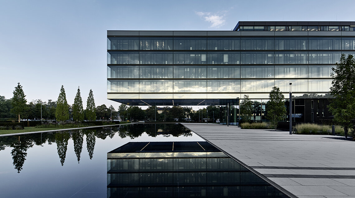 Das 112 m lange Gebäude zeichnet sich durch eine spektakuläre, 32 m lange Auskragung aus. Sie bildet das Vordach für die repräsentative Vorfahrt und das Entrée des Gebäudes. Die Auskragung wird über zwei viergeschossige Stahlfachwerkträger realisiert, die in den massiven Gebäudeteil zurückgehängt werden und im Gebäudeinneren ablesbar sind. Im zweigeschossigen Sockelgebäude sind die Eingangshalle, das Restaurant und der Konferenzbereich untergebracht. Darüber befinden sich vier gläserne Bürogeschosse und ein Staffelgeschoss. Nahezu ein Drittel des Gebäudes scheint frei zu schweben. Das energieeffiziente Gebäude ist in eine 6 ha große, ebenfalls von AS+P gestaltete Parklandschaft eingebettet und wird durch das Schulungs- Bildungs- und Kulturzentrum area3 sowie ein Parkhaus ergänzt.