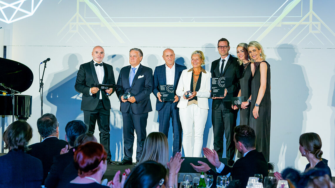 Stolze Gewinner: Geschäftsführer Axel Bienhaus und Susanne Wellershaus, Leiterin Unternehmenskommunikation und Angebotsmanagement (3. und 4. von rechts), auf der Award Gala im Hotel de Rome in Berlin. Foto © EUROPEAN REAL ESTATE BRAND INSTITUTE GmbH
