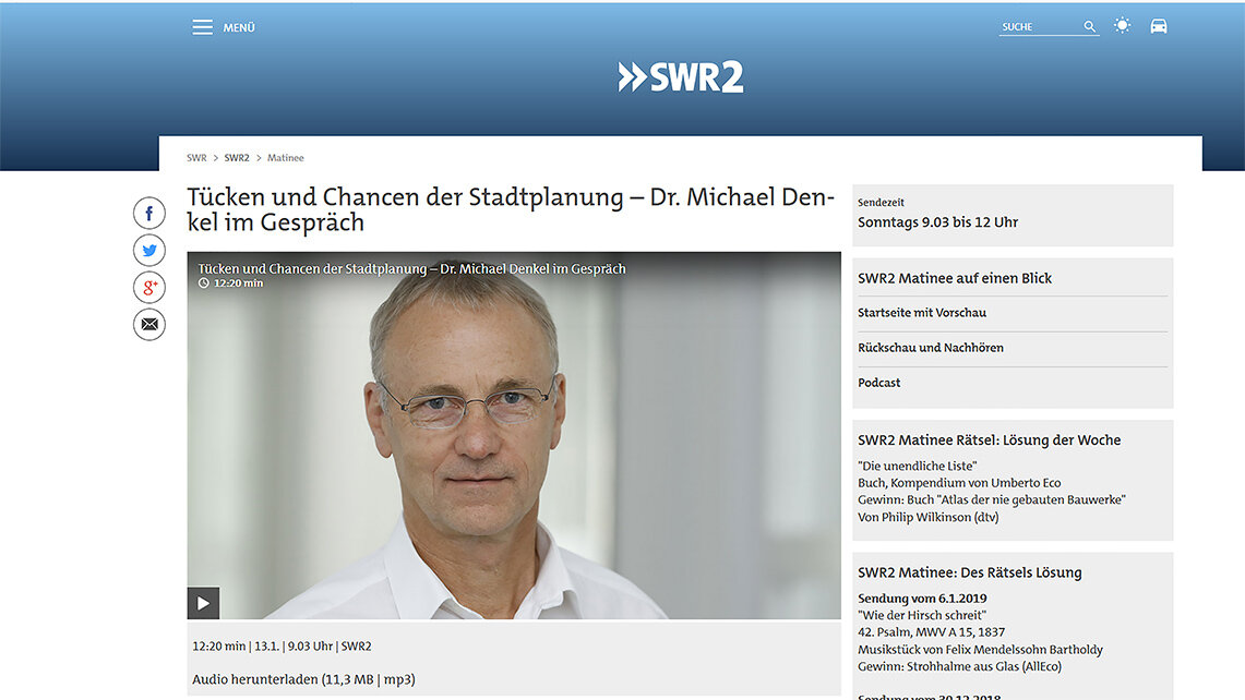Im Interview mit dem SWR2 erklärt Dr. Michael Denkel, Prokurist und Gesellschafter bei AS+P, warum Funktionsmischung bei der Planung eines neuen Stadtquartiers ratsam ist und welche langfristigen Stadtkonzepte für eine Gesellschaft tragbar sind, die sich immer schneller wandelt.