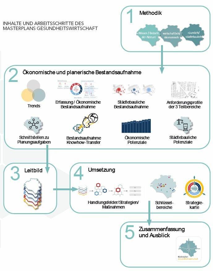 Als städtebauliches Entwicklungs­konzept gemäß Baugesetzbuch dient der Master­plan Ge­sund­heits­wirt­schaft nun als Orientierungsgrundlage für die kommunalpolitischen Entscheidungsfindungen. Er ist Basis für weitere planerische Ansätze auf unter­schiedlich­en Maßstabsebenen, von übergeordneten Konzepten bis hin zu konkreten Vorhaben.