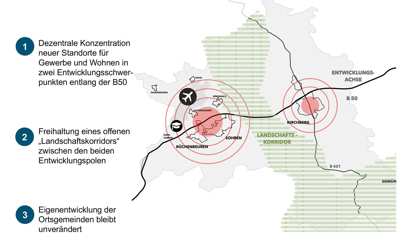 Raumordnerisches und städtebauliches Entwicklungskonzept für die Region um den Flughafen Frankfurt-Hahn und die Stadt Kirchberg. Definition und Abstimmung perspektivischer Entwicklungsflächen für Wohnen, Gewerbe und Einzelhandel
