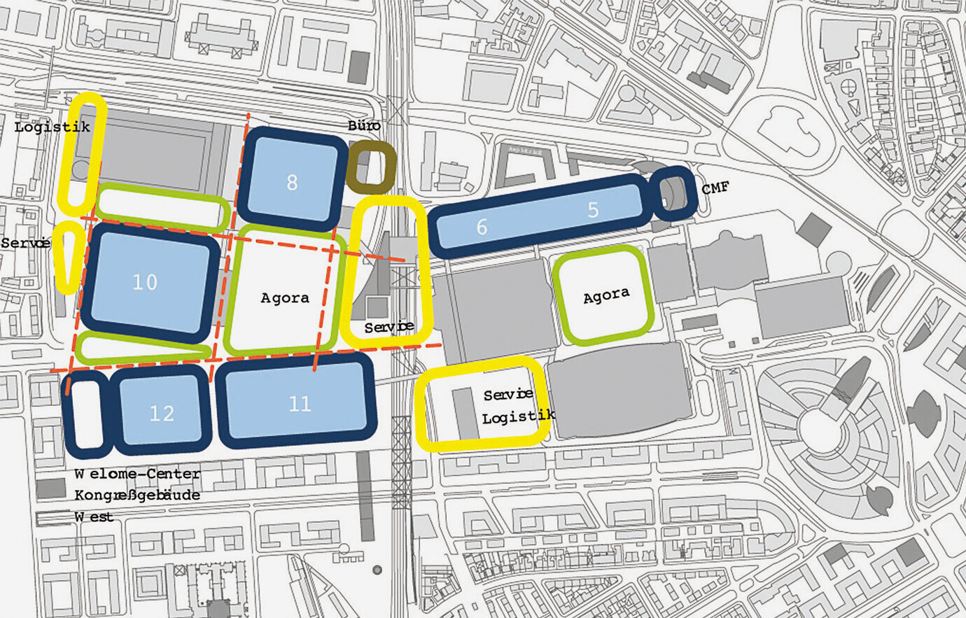 法兰克福展会地块的独特地理位置使得其成为一座独特的内城展会中心。在欧洲主干道和铁路网络中,法兰克福的地位尤为重要,该城市靠近莱茵-美因河,内河航运与总火车站相交联,这些条件为游客提供了巨大的便利。另一方面,这些特征对城市土地的组织和功能性提出了严格的要求。 AS+P 所制定的总体规划可适应截至 2020 年的发展趋势。这份总体规划针对城市建设、功能、交通等方面提出了后续发展规划,并制定了与临近城市区域的交联方案。其中考虑了交通组织和功能组织,制定了一套针对城内和城际交通系统的发展方案。其他规划重点包括采用 Via Mobile 系统来改善游客流通情况的措施,以及针对扩建地块开发施工方案。此外,还对问题区域的设计提出了改善建议,还针对展会中心的逐步修整制定了一份阶段规划。