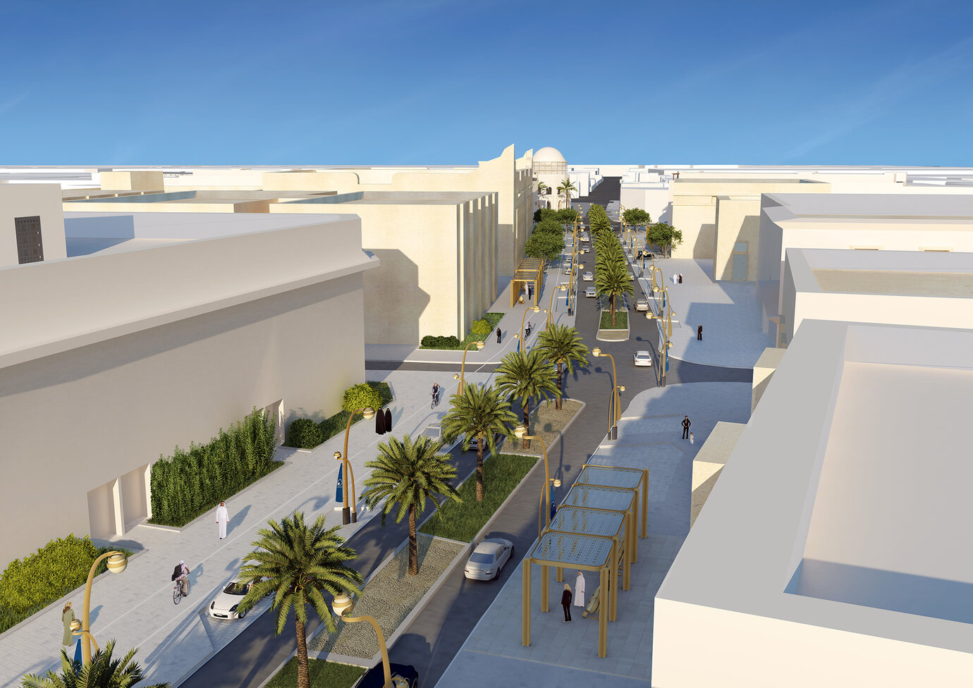 卡塔尔目前正在进行城市复兴,该计划包括城市景观到技术基础设施领域。Q.Mobility 参与了一项城市发展计划,该计划用于研究多哈 Al Wirqab 地区一个试点项目中公共空间的升级和重新设计方案。 AS+P 在一项旨在提高公共区域生活质量和提升城市及建筑外观形象的竞赛中获胜。获胜的设计方案通过加强行人和自行车交通来满足相应要求,除了通过绿化和遮阴措施优化所有道路参与者的交通空间之外,还可以降低外部温度。一方面,整体设计特色尊重卡塔尔的当地艺术风格,以高度的审美标准结合了一致的道路空间设计与道路设施、创造了魅力四射的立面设计和充满艺术感的雕塑。