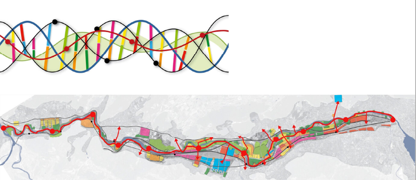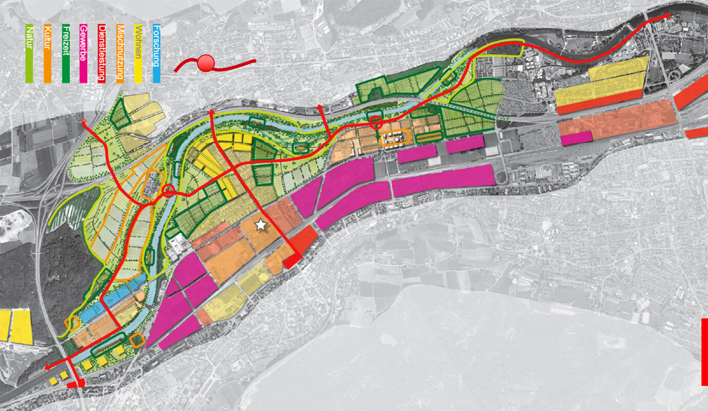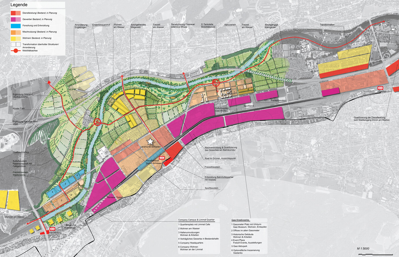 在"Limmattal 空间发展远景"国际创意竞赛过程中,AS+P 针对瑞士城市内人口最稠密和最具活力的一块地区制定了面向 2050 年的跨学科规划方案。该方案的目标在于协调该山谷空间内带状住宅区的结构:其目的在于基于人口密度、混合用途和基础设施网络,制定一套包含城市规划节点布局的多元化空间配置方案。这不是一个大改造、而是需要各个部分共同明显改善住宅型式,而无需政府的宏观干预。 最终目标在于确保和巩固山谷空间内重要的国家和地区交通基础设施功能。通过在整体山谷空间内进行均衡的用途分配和任务分配,以及加强慢性交通概念,需要避免城内路段交通流量过载以及 HB 苏黎世和巴登两个停车地点之间的道路交通流量过载。将通过短途交通轴线连接山谷空间中所分布的各个重点用途区域。通过路途端、沿路风景优美、沿途设立有基础设施(电动自行车充电站、免费 WiFi)等特点,吸引了市民和游客采用步行、骑自行车、电动自行车、溜冰鞋、滑板或直排轮滑等交通方式出行。