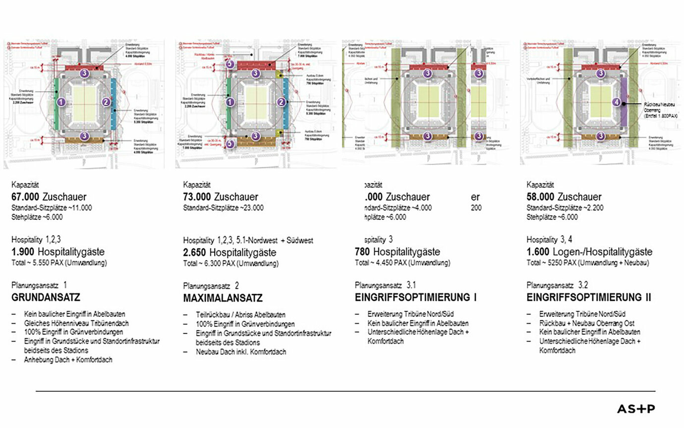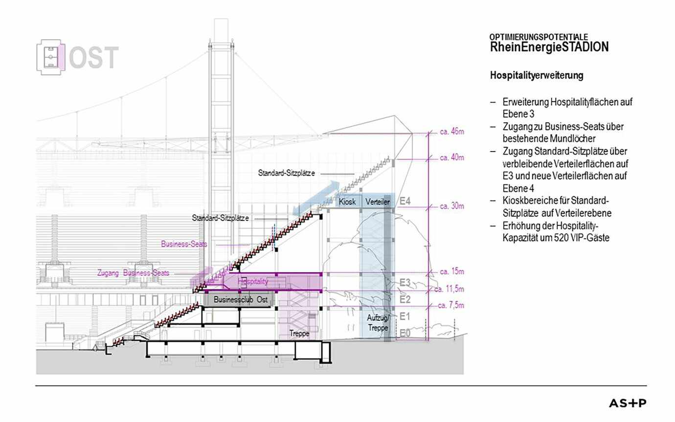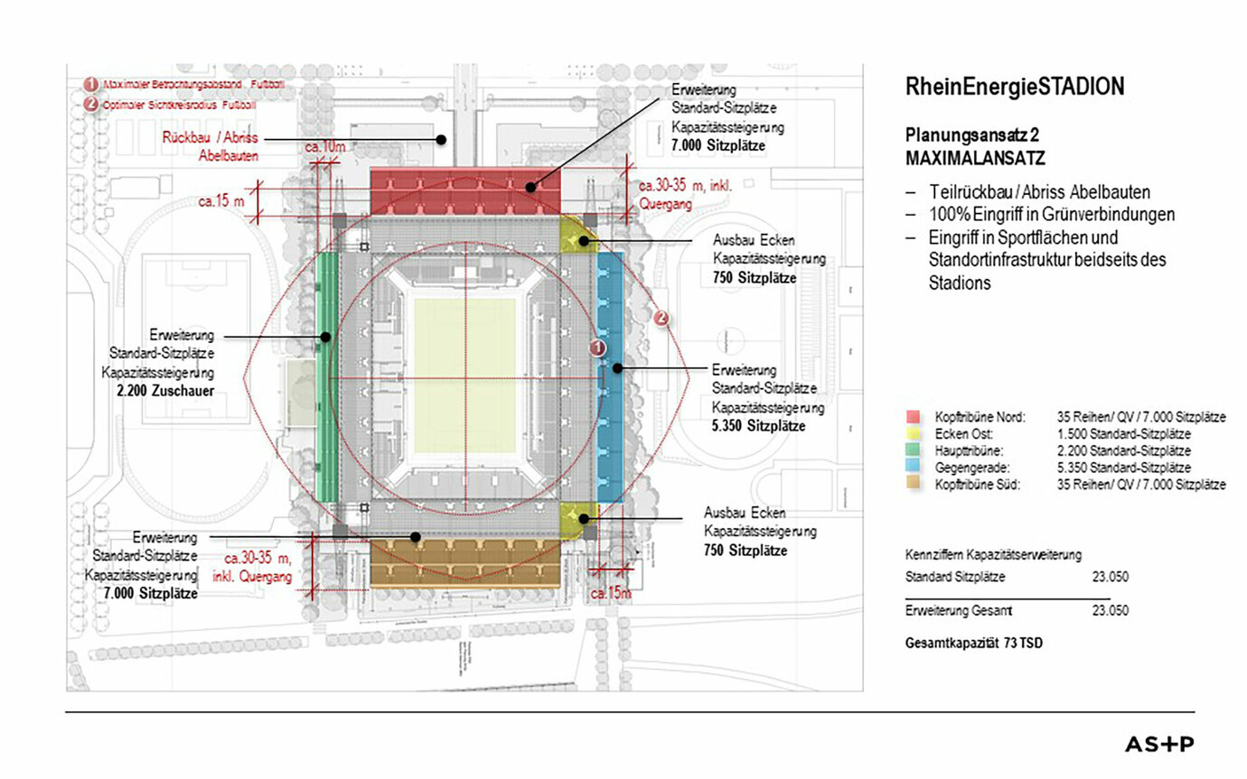 位于科隆 Müngersdorf 城区的 Rheinenergiestadion 体育馆是科隆足球俱乐部在德甲比赛期间的比赛场地。基于粉丝和协会间的紧密联系,这个体育场的运营一定会迎来持续高涨的门票需求。为了优化未来体育馆运营的收入情况,科隆市、Kölner Sportstätten GmbH、科隆足球俱乐部一致同意由 AS+P 在可行性研究期间对 Rheinenergiestadion 体育馆的扩建可行性进行检查。 为了在实景功能规划的基础上提早认识到潜在的开发潜力和项目风险,以及深化实施机遇方面的评估,除了对体育馆扩建和交方案方面的方案构思,还有来自统计、规划法规和建筑法规、隔音技术以及经济专业领域的外部专家参与规划过程。 AS+P 所制定备用方案确定的指标(根据观众群、足迹、面积大小、区域布局、空间高度开发等的比例确定的容纳能力),是外部顾问参与项目管理的基础,并且需要在接下来的项目过程中以及在考虑经济可行性之后,推导出涉及可能产生的委托人费用情况和收益情况的首要项目发展趋势。